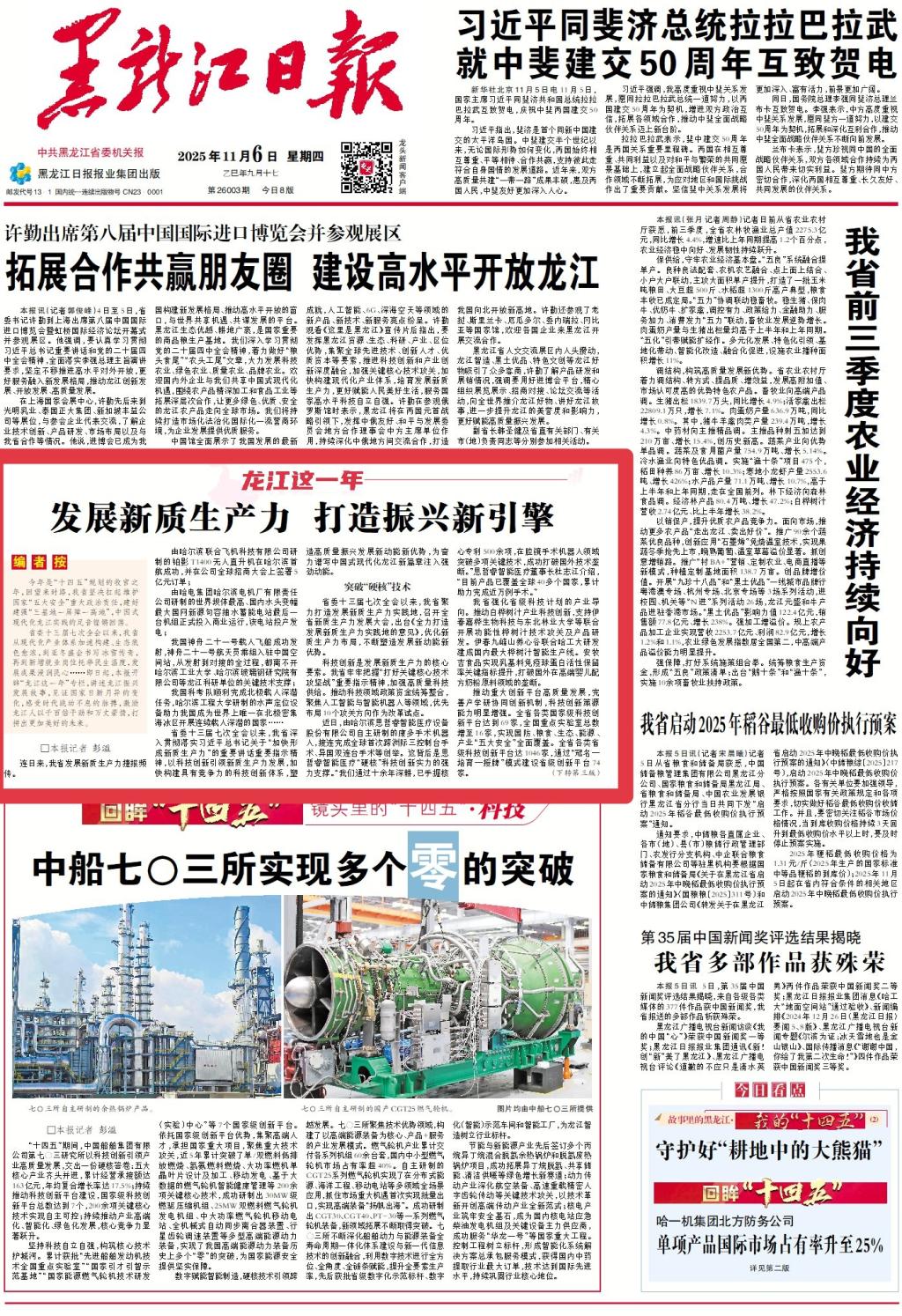今年是“十四五”规划的收官之年,回望来时路,我省坚决扛起维护国家“五大安全”重大政治责任,建好建强“三基地一屏障一高地”,中国式现代化龙江实践的足音铿锵回荡。省委十三届七次全会以来,我省从现代化产业体系加速构建、生态底色愈浓,到亚冬盛会书写冰雪传奇,再到新增就业岗位托举民生温度,发展成果浸润民心……即日起,本报开辟“龙江这一年”专栏,讲述龙江振兴发展故事,见证国家日新月异的变化,感受时代跳动不...