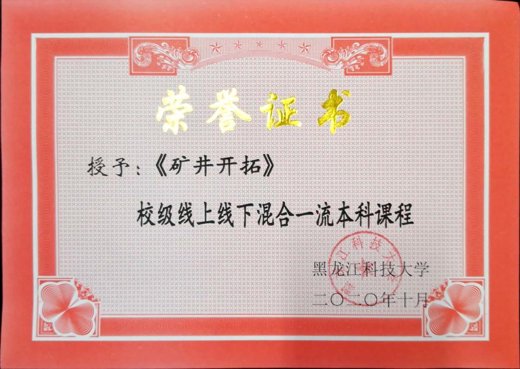 2020年10月,黑龙江科技大学矿业工程学院陈海波老师负责的《矿井开拓》获批校级线上线下混合一流本科课程
